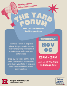 The Yard Forum is a space where Rutgers students can share their perspectives and spark conversations across differences. The Talking Across Difference Student Leader cohort will offer discussion questions on diverse topics, welcoming civil conversation and engagement. Drop by our table at The Yard, meet and connect with the Talking Across Differences Student Leaders, and share your take in a space built for real and respectful conversation!
